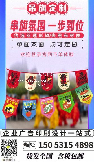 制作串旗的材质基本上为布料春亚纺和尼龙布,也有用经编布和贡缎做的,也可用纸张做。材料是根据客户需求来定的。